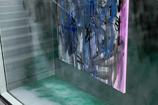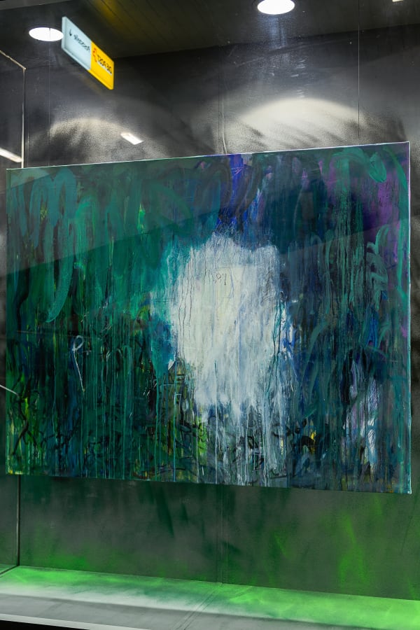 Zero gravity is a collection of images that depict artist's feelings of insecurity, loss, fear, and embarrassment in response to being forcibly cut off from their homeland. The paintings are presented as an autobiographical diary, with expressive brushstrokes, doodles, and barely readable writing. The installation features two paintings hanging on invisible ropes against a deep black background, creating a sense of weightlessness and erasing boundaries between the floor, ceiling, and walls. The layering of paints represents the unstable and rapid pace of everyday life, capturing only bits and pieces of the artist's experience in a chaotic yet ordered way…