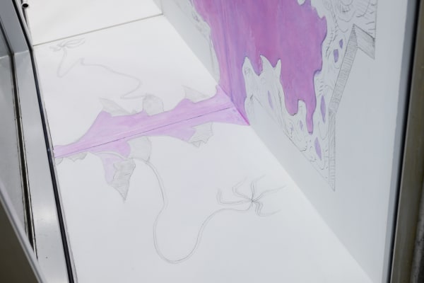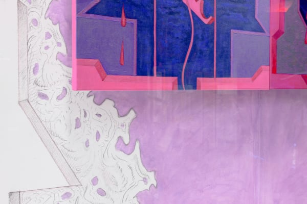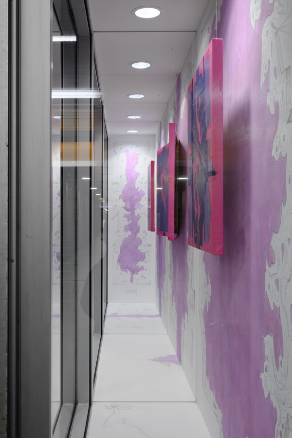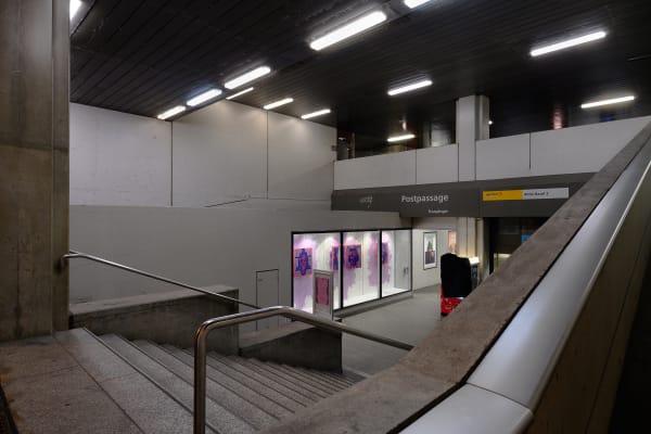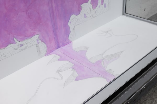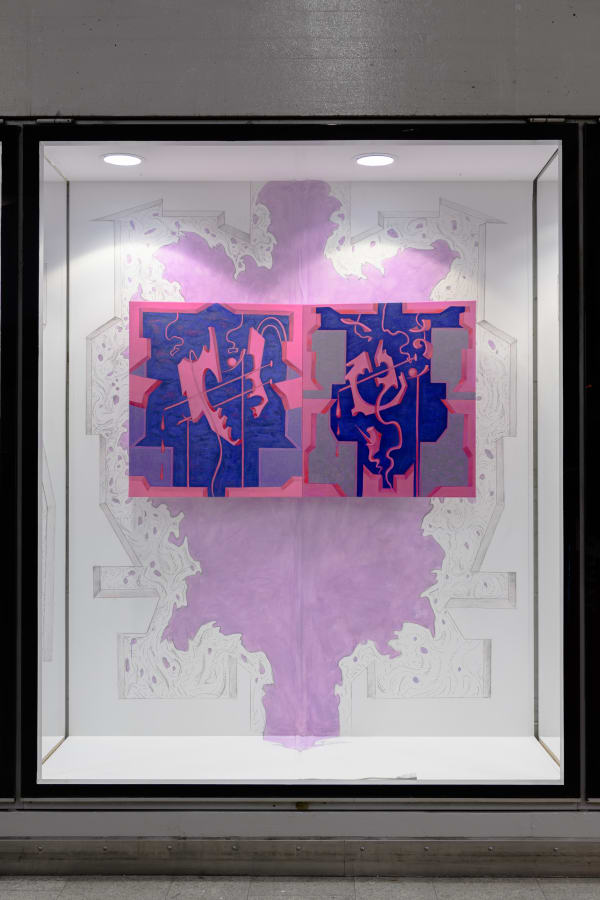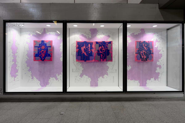 The space of the Voskhod Gallery is a specific frame for the artist's work. The showcase, located in the passage by the railway station, surrounded by technogenic visual and urban solutions, changes the optics of art perception and the method of working on the exposition. The work on the series and the exhibition was formed through the construction of a frame in which the technogenic and manual, ritual and digital collide. Kushaev exaggerates the very idea of a shop window, layering several levels of writing and creating a portal from frames. A technique similar in nature to automatic writing is used. Anton's automatism is based on intuitive configurations of pictorial elements, layered on top of each other into an installation frame. Like a changed, broken coordinate system in icon painting, as if a perspective squeezed out to the viewer, the perception of a site-specific exposition-in-showcase is broken. The showcase transforms into a self-sufficient agent, falling out of the surrounding context. This agent manifests itself as a mystical portal of grief within the technogenic world, sucking into irrational anxiety on the periphery of the "future" and "here and now".